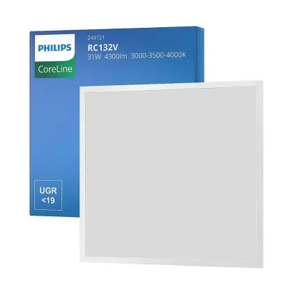 Questo pannello LED di Philips ha dimensione 60x60cm, che lo rende perfetto da montare in un soffitto a griglia, ma può anche essere montato a superficie con degli accessori appositi. Inoltre consuma solo 31 W ma ha una potenza luminosa di 4300 lm, il che lo rende un perfetto sostituto dei tubi fluorescenti 4x18 W. I costi energetici saranno fino al 70% più bassi rispetto a un apparecchio convenzionale.