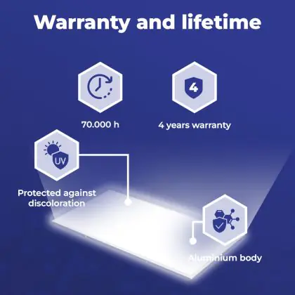 Questo pannello LED ha un ciclo di vita di 70000 ore, che vuol dire che funzionerà in modo ottimale per diversi anni. Questo ti permetterà di risparmiare sui costi di manutenzione e sostituzione! Inoltre, questo pannello LED è protetto da una garanzia di 4 anni. Infine, l'illuminazione LED permette di ridurre le emissioni di CO2 e, non contenendo sostanze tossiche, i LED possono essere riciclati