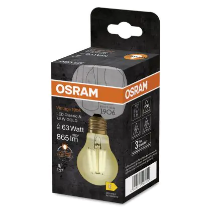 Descrizione Osram Vintage 1906 LED E27 Pera Filamento Oro 7.5W 865lm - 825 Bianco Molto Caldo | Sostitutiva 60W